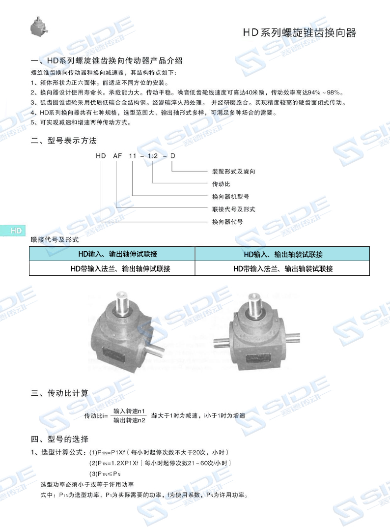 4、HD系列換向器共有七種規(guī)格,選型范圍大,輸出軸形式多樣,可滿足多種場(chǎng)合的需要。